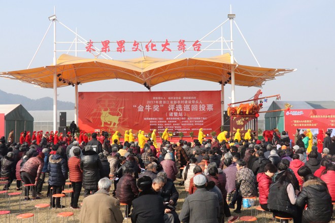 2017年12月11日上午,2017年度浙江省“金牛奖”评选巡回投票诸暨站在米果果小镇文化大舞台举行,现场1000多名周边老百姓和村干部参与现场投票活动,现场邀请了草塔抖狮队和腰鼓队参加表演活跃现场气氛。